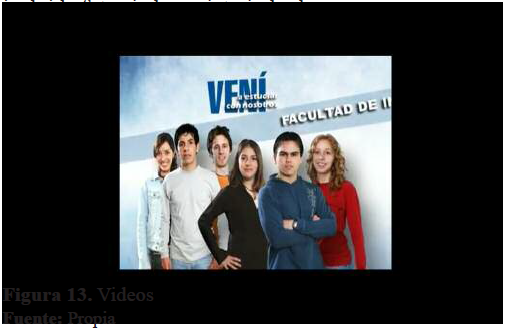 En la Figura 13, se incluye el módulo videos, que muestra los eventos en que participa la facultad de ingeniería y que se dan a conocer a toda la comunidad educativa a través de esta opción. Se encuentran registros sobre Jornadas Tecnológicas, Promoción de Carreras, Video Institucional, entre otros opciones.