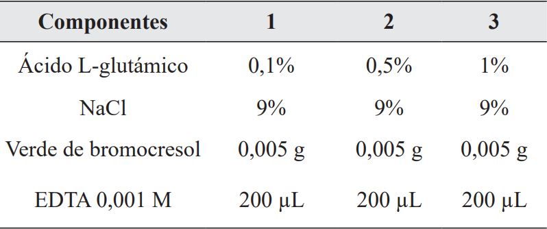 Datos en base a cada 100 mL de agua destilada con pH ajustado a 3,4. Una vez disueltos los componentes, las soluciones se esterilizaron en autoclave (sin el aminoácido) a 10lb por 15 min y posteriormente se añadió el ácido L-glutámico cerca del mechero. El reactivo preparado se almacenó en un frasco ámbar estéril en refrigeración, ya que de esta manera puede mantenerse por un período no mayor a dos meses.