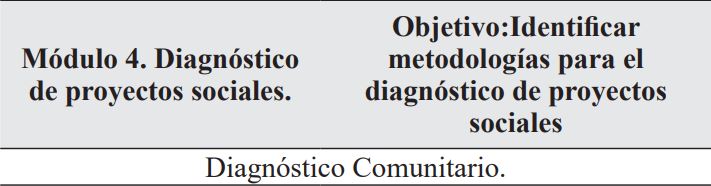 La propuesta tiene por objetivo: ofrecer herramientas para el diseño de proyectos de servicio comunitario. Fue elaborada para el cumplimiento de cinco módulos, de cuatro (4) horas académicas, en un total de veinte (20) horas, permitiendo a los participantes el desarrollo de habilidades y destrezas para el diseño de proyectos de servicio comunitario. Los cinco módulos son: 1) Aspectos teóricos y legales del Servicio Comunitario; 2) Aspectos conceptuales y prácticos de Comunidad, Organización y Participación Comunitaria; 3) Metodologías de enseñanza-aprendizaje (Aprendizaje-Servicio); 4) Diagnóstico y 5)Diseño de proyectos sociales.