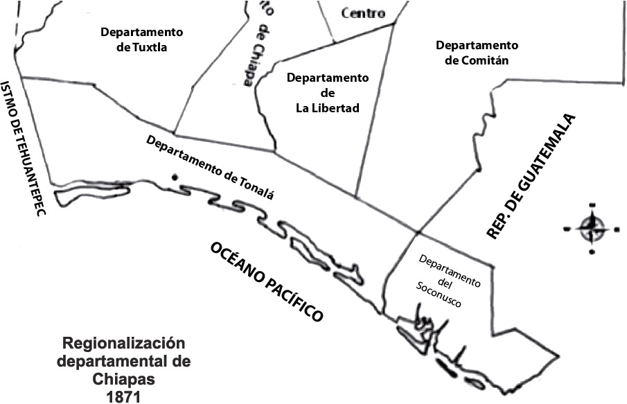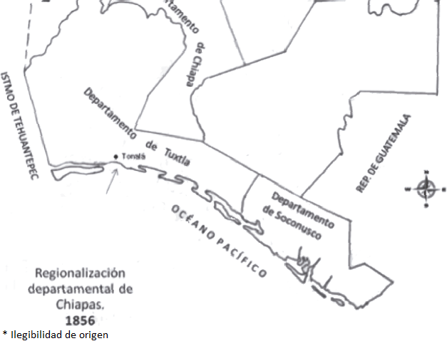 En la carta geográfica de 1856, ordenada por el gobernador Ángel Albino Corzo (Figura 1), en la distribución de regiones, el pueblo de Tonalá aparece adscrito al departamento de Tuxtla; de ese modo, su cabecera se hallaba muy alejada como para abordar cualquier asunto de carácter administrativo.