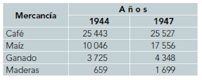 Sin embargo, en la franja costera no había otra opción que el tren, que sobrepasó sus límites de trabajo y realizaba recorridos con el doble de peso permitido, a causa de la gran cantidad de productos que se comercializaban. El Censo Estatal (Gobierno del Estado de Chiapas 1930:10) reconocía que este medio «era insuficiente para aprovechar las grandes posibilidades económicas que el territorio chiapaneco encierra». Era un fenómeno de alta demanda de transporte pero poca capacidad de respuesta de la línea. Las cifras comparativas de cinco años de la década de los cuarenta (Cuadro 4) reflejan el acelerado ritmo de crecimiento de la producción.