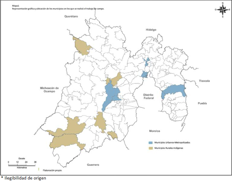 Municipios urbanos-metropolizados: Cuautitlán Izcalli, Tlalnepantla de Baz, Ixtapaluca y Valle de Chalco (pertenecientes a la ZMCM), los dos primeros con la mayor concentración de población de más de 60 años, y los dos últimos con el más bajo porcentaje de población envejecida. De la ZMVT se trabajaron Toluca y Metepec, debido a que presentaron la más alta cobertura de derechohabientes por alguna institución de seguridad social y de salud.
