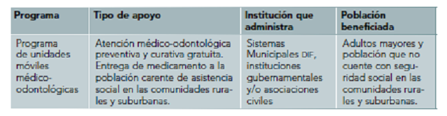 A continuación (Cuadro 1) se presentan los programas vigentes para la actual administración que se dirigen o que de alguna manera incluye a la población envejecida: