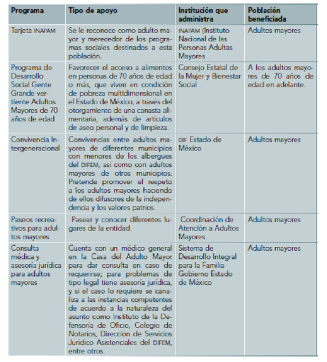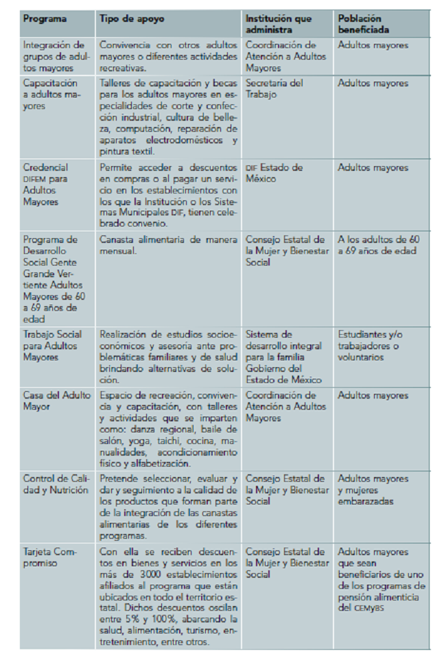 En el Estado de México los programas sociales y asistenciales que atienden a la población envejecida están a cargo del Sistema para el Desarrollo Integral de la Familia (DIF), dentro del Comité Estatal para la Atención del Adulto Mayor, donde en su programa 2010 consistía en grupos de trabajo de: