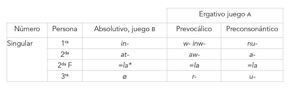 El k’iche’ tiene marcación en el núcleo y tiene orden VOS al igual que la mayoría de las lenguas mayas. Es una lengua ergativa (morfológica y sintácticamente, aunque en este artículo no se mostrarán los detalles), marca de igual forma el s (sujeto intransitivo) y O (objeto transitivo) con marcas absolutivas, también marca de manera diferente al A (sujeto transitivo) con marcas ergativas. Estos dos juegos de marcas de persona se denominan b y A, respectivamente, en la literatura maya. En la Tabla 1 muestro estos marcadores de persona.
