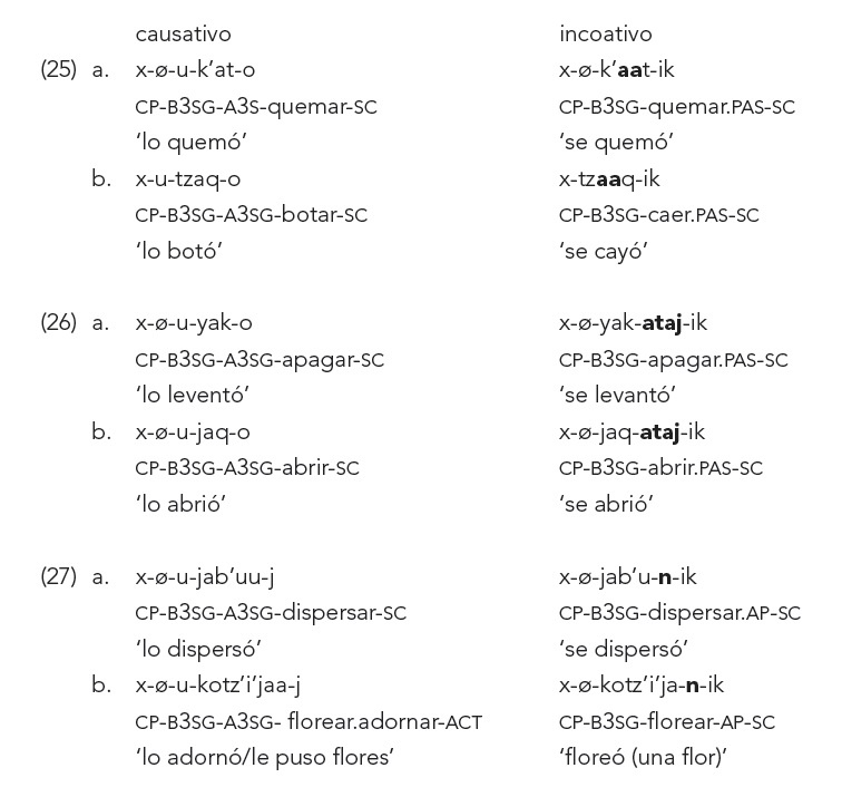 A partir de los datos presentados se puede ver que de los verbos transitivos radicales y los incoativos se derivan con morfología pasiva (25-26), y que de los verbos transitivos derivados se derivan incoativos con morfología antipasiva (27 y 31). Esta es solo una tendencia, ya que se encuentran algunas excepciones, por ejemplo, en (34) el verbo es transitivo derivado, pero emplea el sufijo pasivo -taj para derivar del incoativo.