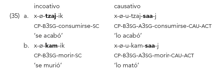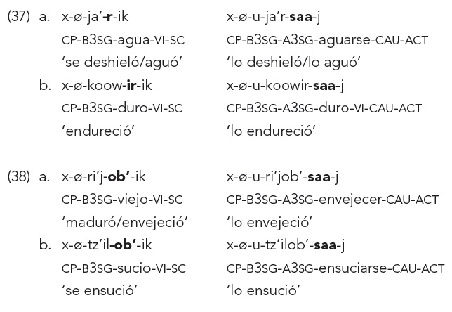 En (37-38) los verbos incoativos tienen bases intransitivas derivadas. Dichas bases se derivan de adjetivos por medio de dos tipos de sufijos. En (37) las bases intransitivas se derivan con el sufijo -(V)r y en (38) con el sufijo -ob’. El par transitivo se forma agregando el sufijo -(it)saa a esta base.