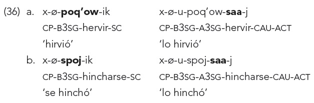 El ejemplo en (36a) tiene la raíz poq’ ‘hervir’ y el sufijo -ow para convertirlo en un verbo intransitivo. El ejemplo en (36b) es una raíz intransitiva.