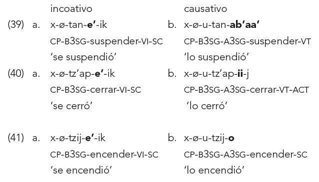 Finalmente, de los tres subtipos del tipo ‘no directo’ sólo se han encontrado datos para el equipolente en k’iche’. En el equipolente tanto el incoativo como el causativo vienen de la misma raíz pero ninguno se deriva del otro. En k’iche’ los ejemplos de este subtipo vienen de raíces posicionales o posicionales/transitivas. El incoativo se deriva con -e’ y el causativo con el sufijo -(V)b’aa’/-V:, como en (39 y 40) respectivamente. Cuando la raíz es ambivalente, posicional-verbal, se usa -e’ para el incoativo y no hay sufijo derivativo para el causativo porque es un verbo transitivo radical, como en (41).14