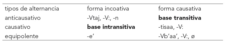 En el tipo anticausativo el verbo básico es el causativo y el incoativo es el derivado. El causativo es un verbo transitivo que puede ser radical como en (25-26) o derivado como en (27). En todos los casos, el incoativo se deriva con un sufijo que puede ser la prolongación vocálica como en (25), -Vtaj, como en (26) y -n, como en (27).