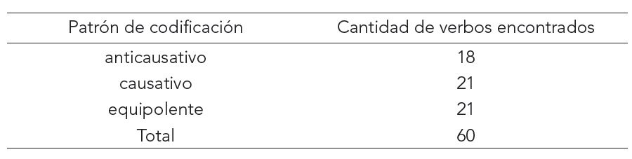 En la Tabla 3 presento las cantidades de ejemplos encontrados para cada patrón de codificación de los pares de verbos incoativo-causativo