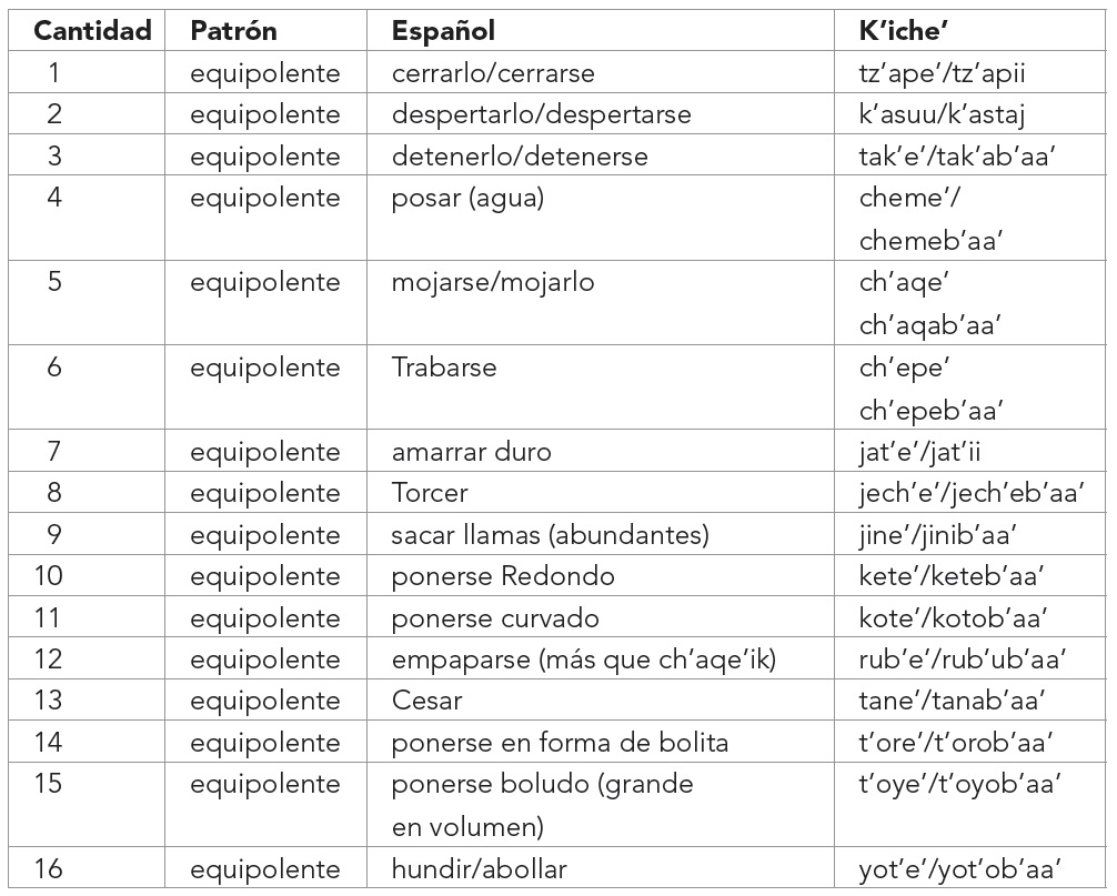 El siguiente cuadro (Tabla 4) contiene los pares de verbos identificados y analizados en el presente estudio. La columna del k’iche’ contiene únicamente las raíces o bases verbales.