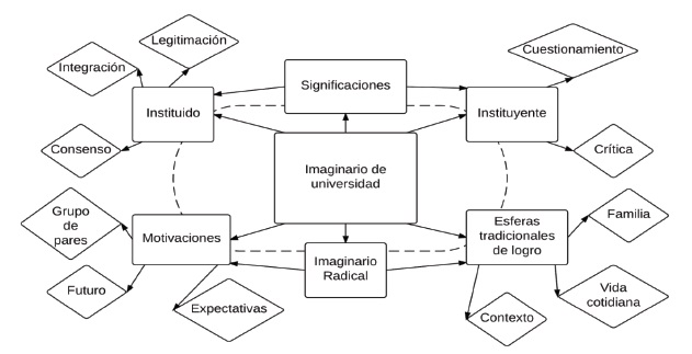El imaginario social universitario es un conjunto de esquemas organizadores que son condición de representatividad de la universidad, tanto en un nivel general como en el marco de las experiencias particulares de cada estudiante. Lo imaginario se organiza como una compleja red de relaciones sobre la que se sostienen los discursos y las prácticas propias de la universidad. Las relaciones que se tejen como parte de las significaciones sociales, según las describe Cabrera (2006), entrañan posicionamientos de legitimación, integración, consenso (elementos entendidos como explicación, fuente de sentido y plausibilidad subjetiva, estimulan, permiten y prohíben la acción social de los jóvenes), cuestionamiento, crítica (reforma y cambio a partir de los significados que los jóvenes le otorgan su acción dentro de condiciones ya legitimadas), imaginarios radicales (sentido indiscutible e indiscutido, soporte de las articulaciones y las distinciones entre lo que importa y lo que no en la elección de la universidad y dentro de ella), así como modelos instituidos (marca una dirección de sentido que los jóvenes viven como normas, valores, lenguaje, imágenes y formas; así, las instituciones no son solo herramientas de creación sino formadores de subjetividades) e instituyentes (una significación propia desde la experiencia individual de los jóvenes).