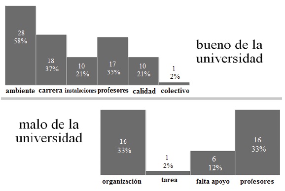 Rescatan tanto los elementos positivos como negativos de la universidad. Las reflexiones sobre este tema son diversas y enfocadas hacia la calidad que brinda la universidad en sus diferentes rubros. A fin de establecer un comparativo, la gráfica 1 destaca cómo de los 48 entrevistados, 98% (47 jóvenes) reconoció aspectos positivos de la universidad; mientras que 73% (35 sujetos) consideró que la universidad tenía algún aspecto negativo.