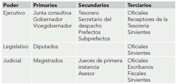 Como puede suponerse, estudiar a todos los sujetos que tuvieron un empleo o cargo público resultaba un trabajo titánico, por ello se decidió hacer una limitación del grupo de estudio (véase Tabla 1). Para ello decidí clasificar este universo en tres sectores: el primario, constituido por altos mandos de los poderes, asignados a sus puestos por elección (de la ciudadanía o del congreso local); el secundario, por sujetos que hayan ocupado puestos de confianza, elegidos por los altos mandos de uno o dos de los poderes; y el terciario, por personas que hayan estado en puestos administrativos, considerados preburócratas.7