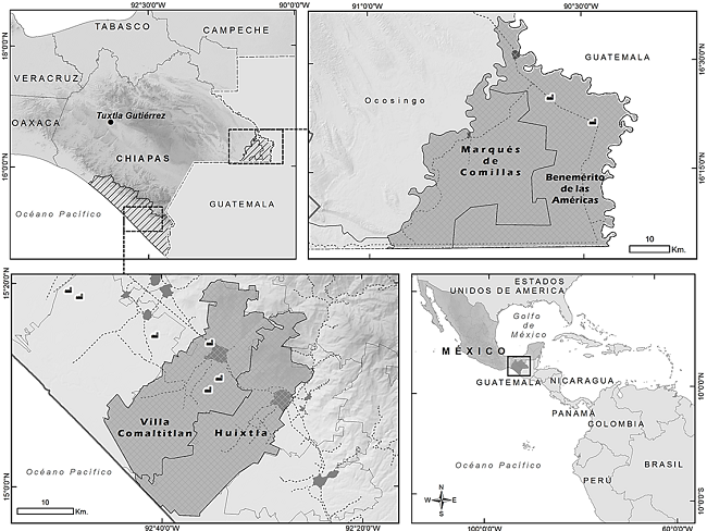 Este estudio es resultado de 16 meses de trabajo de campo con enfoque etnográfico que llevé a cabo entre 2011 y 2017 en la región del Soconusco (en los municipios de Huixtla y Villa Comaltitlán) y en el sur de la Selva Lacandona (Benemérito de las Américas y Marqués de Comillas), así como en ciudades relevantes de cada región y del país (Figura 1). Durante este periodo elaboré un diario de campo con 185 registros de observación y realicé para este artículo 108 entrevistas, distribuidas de la siguiente manera: pequeños productores de palma (40), encargados de plantaciones del sector privado (11), representantes de organizaciones de pequeños productores de palma (16), representantes de otras organizaciones productivas (15), líderes de organizaciones campesinas de importancia histórica en las regiones de estudio (8), autoridades comunitarias (7) y funcionarios y técnicos vinculados a gobierno (11). Recurrí, además, a métodos complementarios como el levantamiento de una encuesta a 250 productores de palma en 2012-2013 para obtener información sobre prácticas productivas y características socio-económicas de los productores, y a la recolección de documentos de archivo y contemporáneos.