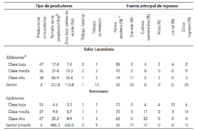 En cuanto a los productores de palma de aceite en México podemos distinguir entre pequeños (( 50 hectáreas sembradas con palma de aceite( y grandes (( 50 hectáreas). Los primeros viven, en la mayoría de los casos, en tierras tituladas como propiedad ejidal, mientras que los segundos suelen estar bajo propiedad privada, siendo, por tanto, con frecuencia identificados como «ejidatarios» y «sector privado», respectivamente. A diferencia del sector privado, los ejidatarios dependen en buena medida de la mano de obra familiar y suelen, además, tener otros cultivos y, en ocasiones, algunas cabezas de ganado. Este tipo de productor varía dentro de cada región dadas las diferencias de clase y entre regiones dado el contexto agrario y los vínculos existentes con la economía de mercado. En el Soconusco, según la encuesta, los productores de palma tenían en promedio 9.8 hectáreas de propiedad, de las cuales 5.5 tenían palma de aceite sembrada (Cuadro 1). En la Selva Lacandona los productores poseían 42.8 hectáreas, de las cuales 13.8 correspondían al cultivo de palma. En cuanto a la orientación al mercado, los ejidatarios del Soconusco transitaron de cultivos comerciales a palma, mientras que en la Selva la conversión fue, con frecuencia, de ganado a palma,8 habiendo un pequeño porcentaje de ejidatarios en ambas regiones que antes de la palma vivía de jornalear.