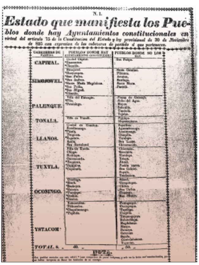 Si bien es cierto que no contamos con información veraz sobre el número total de ayuntamientos constitucionales que surgieron en 1821, sí tenemos un listado de los que había en territorio chiapaneco en 1829 (imagen 1). Este documento, sumamente importante, expresa en su encabezado: “Estado que manifiesta los Pueblos donde hay Ayuntamientos constitucionales en virtud del artículo 75 de la Constitución del Estado y ley provisional de 1825 con expresión de cabeceras de partido a que pertenecen”. Es decir, los que se formaron en Chiapas después de su integración a México en 1824.