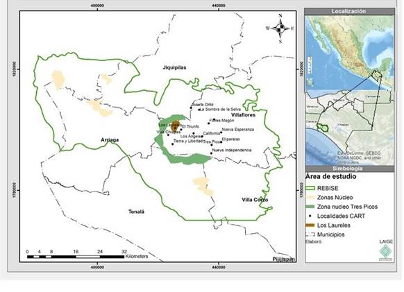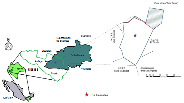 La localidad de Los Laureles se ubica en la cuenca alta del río El Tablón en la REBISE, coordenadas 16°17’06.80 al norte y 93°41’46 al oeste, a una altitud de 1 128 msnm en el municipio de Villaflores, Chiapas. Los trece ejidos -además de Los Laureles- asentados en la cuenca (figura 1) colindan con la zona núcleo de mayor superficie (7 267 ha) conocida localmente como Tres Picos (DOF, 1995). Ocupa una superficie de 827 ha. Su punto más alto está a 1200 msnm y las familias locales lo llaman Cerro Pecho Blanco. La cubierta forestal es bosque de neblina en la parte superior, pino-encino en la parte intermedia y selva baja subcaducifolia en la parte baja. Los predios forestados y deforestados se distribuyen en un mosaico intrincado. En temporadas de lluvias, los arroyos se extienden hasta los caminos. Además el río El Tablón ha llegado a desbordarse y limitar el acceso a la comunidad (MCDRR-UACh, 2014).