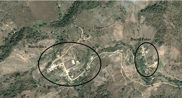 El poblado se conforma por dos pequeños asentamientos denominados por la gente local como Barrio Rico y Barrio Pobre (figura 2). Las familias campesinas que colonizaron Los Laureles provienen en su mayoría de localidades cercanas a la REBISE (Valle Morelos municipio de Villacorzo y Mapastepec) y en menor medida de otras no tan cercanas (San Juan Chamula y Simojovel). La estructura social de la localidad se basa en agrupaciones a) el grupo del comisariado, b) el grupo de los indígenas y c) el grupo del apoderado. En el Barrio Rico se asentaron las familias de los grupos del comisariado y el apoderado; la zona se caracteriza por contar con infraestructura (escuelas, casa ejidal, casa de salud y parque). En el Barrio Pobre se establecieron las familias del grupo de los indígenas con viviendas dispersas y sin ningún tipo de infraestructura.