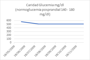 Durante las visitas se le realizaron mediciones de la glucosa plasmática posprandial, es decir, posterior a la ingesta de alimentos, y los resultados fueron siempre por arriba de 500 mg/dl, alarmantemente elevados (véase gráfico 1), a pesar de lo cual en todo momento se negó a asistir a los servicios públicos de atención médica. Ello a su vez explica el deterioro corporal.
