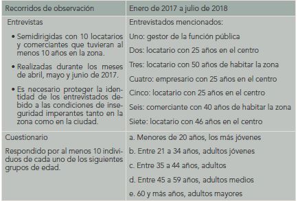 Como se expresa en el cuadro 1, hemos realizado primero un ejercicio de descripción densa derivada de observaciones durante los recorridos de campo y ampliada por la indagación bibliográfica; de ese modo se logra mostrar el desarrollo reciente y la incidencia de las interacciones de los actores sociales, es decir, entre los sujetos y los espacios. Se muestra a comerciantes y consumidores; también a visitantes frecuentes u ocasionales. Asimismo, se traen a colación los proyectos impulsados por las autoridades o los propietarios para uniformar, remodelar o simplemente mostrar las fachadas de los establecimientos, y la toma de decisiones direccionadas hacia su eliminación, transformación o permanencia. Además de los recorridos por la zona, realizamos entrevistas semidirigidas con comerciantes, locatarios, visitantes y algunos representantes de la administración pública; todos ellos aludieron a problemáticas cotidianas y hablaron de algunas estrategias para cohabitar con las autoridades de la ciudad. Finalmente, aplicamos un cuestionario entre los consumidores del centro, divididos por grupos de edad, para identificar el uso y las posibilidades de disfrute de este espacio entre diferentes sectores de la población. Es decir, que esta propuesta no se elabora únicamente desde el análisis y la interpretación en el papel que realizan los estudiosos; la etnografía nos permite traer a estas líneas la propia voz y las percepciones directas de aquellos que habitan a diario el centro de esta ciudad.