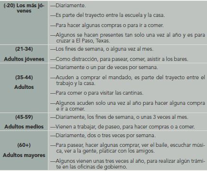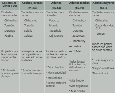 Los consumidores o visitantes comentaron su experiencia de haber visitado algún otro centro histórico. Entre los dos conjuntos de jóvenes se debe subrayar que son mayoría los que no han paseado por otras ciudades. Como se mencionó líneas atrás, la ubicación de Juárez le impone la lejanía como constante hacia cualquier otra ciudad mexicana. Por su parte, los adultos, los adultos medios y los adultos mayores han visitado otros centros, en las zonas sur, centro y norte del país. Los comentarios entre los cinco grupos de edad coinciden en que, en comparación con otros centros, el de Ciudad Juárez se mantiene en peores condiciones de limpieza, estética, seguridad e incluso con respecto a la preservación de edificios antiguos (véase cuadro V).