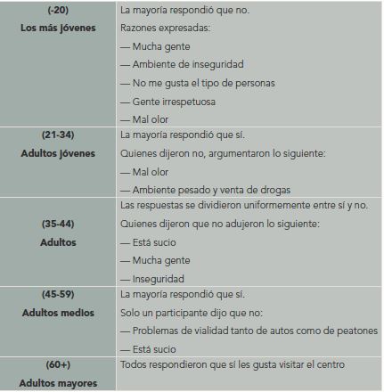 La segunda pregunta fue específica acerca del gusto o agrado por el espacio que nos ocupa (véase cuadro III). A los más jóvenes suele gustarles menos que a los de mayor edad. Los primeros externaron una serie de razones para su desagrado relacionadas con la inseguridad y el tipo de personas con quienes coinciden en ese espacio. Por su parte, los adultos jóvenes también hicieron énfasis en el ambiente «pesado» que encuentran. La población de adultos también percibe la inseguridad en el entorno del centro. Por su parte, los adultos medios y los adultos mayores parecen menos preocupados por la inseguridad, tal vez porque están más familiarizados, mientras que los más jóvenes se sienten vulnerables en ese espacio. Los adultos mayores, tal vez como resultado de su madurez y experiencia de vida, no emitieron ninguna inconformidad, simplemente disfrutan de estar ahí. En los cuatro conjuntos restantes sobresale la coincidencia sobre la suciedad y pestilencia del lugar.