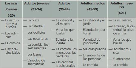 La tercera pregunta nos permite conocer lo que les gusta del centro de la ciudad. Todos, desde los más jóvenes hasta los adultos mayores, disfrutan de los inmuebles monumentales como la catedral, el museo, la plaza de armas. Todos hicieron referencia también a la variedad de opciones de mercancías que pueden elegir. Igualmente, comentaron que disfrutan los antojitos, restaurantes y las alternativas para comer en la zona. Los más jóvenes y los adultos jóvenes no mencionaron nada acerca del disfrute de convivir o simplemente ver a otras personas; sin embargo, los tres grupos de edad restantes declararon que les complace de mirar a otros, saludarlos e incluso bailar y ser parte del ambiente que se genera (véase cuadro IV).