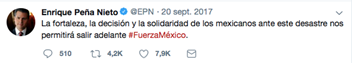 Al respecto, Guha (1999) refiere que el discurso primario es aquel que emerge desde los grupos que ostentan el poder oficial y por ello, se asume que cuentan con los recursos válidos para construir la versión de lo ocurrido; este discurso se produce en el momento inmediato o casi inmediato a la ocurrencia del evento. Así, por ejemplo, para el caso de Twitter, tenemos las publicaciones que, a minutos de un evento de suma relevancia, se realizan desde los perfiles de funcionarios públicos o instituciones gubernamentales. Ejemplo de ello es la siguiente publicación (Imagen 1) con el hashtag #FuerzaMéxico a propósito del sismo del 19 de septiembre de 2017 (19S), ocurrido en la zona centro-sur del país: