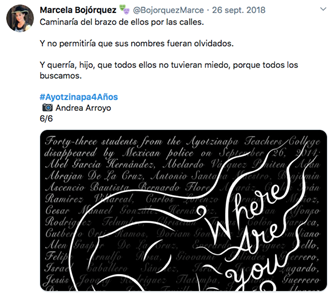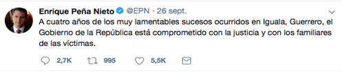 Otro caso ilustrativo del hashtag como posible lugar de memoria y de concurrencia de posiciones frente al pasado es #Ayotzinapa4Años. A cuatro años de la desaparición forzada de 43 estudiantes de la Escuela Normal Rural “Raúl Isidro Burgos”9, el 26 de septiembre de 2018 el expresidente Enrique Peña Nieto recordó el suceso (Imagen 10). Similar a lo ocurrido con el 19S, se sostuvo la imagen de un Estado que velaba por los intereses de sus ciudadanos(as) pero, en contraste, aquí se reconoció la figura de «víctima».
