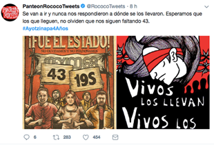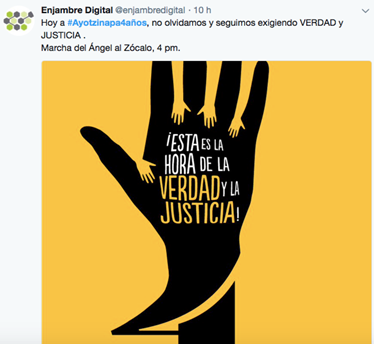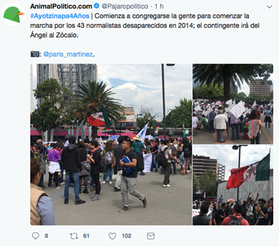 Derivado de las miles de publicaciones que circularon en aquella ocasión y emplearon el hashtag #Ayotzinapa4Años, el evento se colocó como segundo trending topic del día y Twitter se refirió a él dentro de Twitter Moments en Español; además, se observó un extenso despliegue de ejercicios de memoria construidos desde las distintas visiones que, pasados los años, se han construido sobre lo acontecido con los 43 jóvenes. En este pasar del tiempo el hashtag facilita el seguimiento de la memoria y las formas en que evoluciona, actores que se suman y/o se alejan, discursos que se integran o se diluyen.