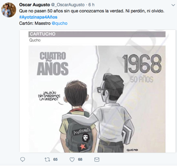 Otra potencialidad del hashtag es la de fungir como espacio articulador de memorias. Al respecto, se muestra cómo, bajo el mismo hashtag, en las imágenes 13 y 14 referentes a los 43 estudiantes de Ayotzinapa, se realizan cruces de memoria con la matanza de estudiantes de 1968 y, para el caso de la imagen 13, también se intersecta con el sismo de septiembre de 2017. Esta convergencia de memorias se da a partir de considerar que los tres eventos tuvieron como telón de fondo a un Estado culpable y omiso.
