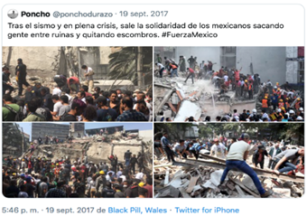 A diferencia del momento histórico que pudo analizar Guha, hoy en día Internet permite estar al tanto de lo ocurrido en tiempo real en cualquier parte del mundo, así como pronunciarse al respecto de forma global y masiva. Así, el criterio de producción inmediata del discurso primario no está ceñido al Estado, por lo que la aparición de este discurso puede alternar con discursos no oficiales. Pese a dicha posibilidad, lo cierto es que la cercanía en tiempo con el evento en cuestión parece estar relacionada con la escasez de lo que Guha llamaría «prosas insurgentes» en Twitter el día en que aconteció el sismo de 2017: en este caso, las publicaciones de usuarios comunes se focalizaban en dar a conocer lo ocurrido, solicitar y organizar ayuda o dar muestras de solidaridad (Imagen 2), entre otras, pero no a cuestionar los posicionamientos del Estado. Es interesante cómo el factor «inmediatez» diluye la utilización de estos espacios para la producción y difusión de discursos alternativos a los oficiales.