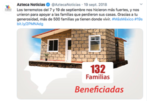 El segundo discurso, también llamado secundario, se encuentra más distante en el tiempo y se produce desde espacios supuestamente neutrales (como las agencias noticiosas), aunque su propósito es dar continuidad al primero. Tanto el discurso primario como el secundario buscan desvirtuar la perspectiva de grupos opositores, dado que no la reconocen siquiera (Guha, 1999). Un ejemplo de este tipo de discurso es la publicación de una de las cadenas de televisión abierta más populares en México a un año del sismo y que se alinea al discurso oficial de apoyo y solidaridad con las personas damnificadas (Imagen 3).