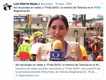 Finalmente, el discurso terciario es aquel elaborado por individuos o grupos que no tienen obligación de representar el punto de vista de los grupos de poder (pero que no por ello carecen de posición(, por lo que suelen inclinarse más por representar las opiniones de la izquierda (Guha, 1999) o, por lo menos, alternativas. Al respecto, en la imagen 4 se muestra una publicación a dos años del sismo que retoma el hashtag 19S para recordar y señalar la colusión entre medios de comunicación y Estado en la construcción de una de las crónicas acusadas como «cortina de humo» en los días subsecuentes al sismo, me refiero al caso de la niña Frida Sofía. La historia de una supuesta niña sepultada bajo los escombros de un colegio que colapsó tras el sismo acaparó gran parte de la cobertura de otra de las televisoras más importantes del país y, con ello, la atención de buen número de televidentes. Días después se supo que la existencia de Frida Sofía, al igual que la supuesta comunicación que personal de la Secretaría de Marina habían mantenido con ella, formaban parte de una especie de montaje, el cual no fue aceptado como tal por parte de las autoridades, las cuales simplemente desmintieron su versión previa. Esta historia recibió una cobertura mediática y fue tendencia en Twitter: en un primer momento, por tratarse de una historia que conmovía y congregaba a buen número de usuarios(as) en torno a desear el pronto rescate de la niña y, posteriormente, por ser considerada una mentira organizada por el gobierno mexicano con apoyo de algunos medios de comunicación.