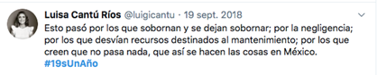 Como parte de esas posiciones contrarias, en el primer aniversario del 19S, hashtag como #19sUnAño fueron empleados en Twitter no solo para rememorar el acontecimiento, sino para señalar las prácticas de corrupción nacionales y locales que acompañaron el reparto de ayuda a los damnificados por el sismo, así como aquellas que, por obra u omisión, fueron partícipes del colapso de algunas construcciones. Sobre este punto, cabe señalar que tras el terremoto de 1985 se realizaron modificaciones a la normatividad para construcción en México; sin embargo, tras el sismo de 2017 algunas irregularidades quedaron al descubierto, mismas que podrían explicar algunos derrumbes de edificios y las consiguientes pérdidas humanas. Al respecto, tuits como el de la imagen 5 rememoran dinámicas de corrupción que forman parte del evento en cuestión, pero que también constituyen antecedentes de la tragedia asociada al evento.