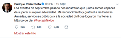 Para Nora (1984) , el propósito de los lugares de memoria es el de conservar y mantener vivas las conmemoraciones del pasado, ya que se asume, por un lado, que no existe memoria espontánea, sino que hay que evocarla y, por otro, que como el paso del tiempo conlleva un incremento de información, existe mayor probabilidad de que se olviden algunas cosas, por lo que la memoria se encarga de documentar y evitar así el olvido. En este sentido, el hashtag en Twitter puede entenderse como una forma de organizar y conservar (imposible determinar por cuánto tiempo( las memorias de diversos grupos frente a un mismo evento. Incluso, es posible organizar a las personas con base en el contenido de memoria que defienden. El verbo defender es relevante para Nora (1984) pues apunta a otro objetivo de los lugares de memoria: el de amparar al cúmulo de recuerdos que la Historia (comprendida como discurso oficial) amenaza con apropiarse para distorsionar y/u omitir. Si retomamos el evento del sismo del 19 de septiembre de 2017, el mismo día, pero del 2018, para conmemorar el evento el Estado empleó prácticamente la misma posición que enunció en el momento de los hechos (Imagen 6).