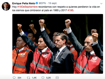 Respecto al uso de imágenes, estas ayudan a configurar escenas particulares sobre aquello que se pretende instalar como memoria. Un ejemplo de lo anterior es lo que se observa en la imagen 7, donde se representa al entonces presidente del país que rememora el 19S con el puño levantado, señal que realizaban las y los rescatistas durante la remoción de escombros y que significaba «guardar silencio» ante la posibilidad de que existiera una persona con vida que pidiera auxilio; y es, al mismo tiempo, un símbolo del compromiso y arduo trabajo que cientos de personas realizaron durante los trabajados de búsqueda y rescate.