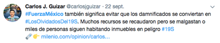 En contraparte, otros usuarios, como el que se muestra en la imagen 8, hicieron explícito, con ayuda del mismo hashtag, detalles de esa memoria que se omiten en el discurso oficial y que, además, proporcionan existencia a otros actores, como es el caso de «los(as) damnificados(as)» (los cuales incluso convergen con otro hashtag titulado #LosOlvidadosDel19S).