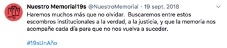 Algunas de estas voces al margen del discurso oficial se constituyeron como espacios particulares en Twitter a modo de cuentas, tal fue el caso de “Nuestro Memorial 19S” (Imagen 9). En estos espacios simbólico-digitales se observa cómo los lugares de memoria surgen de una intención y que su operatividad refiere sí, al pasado, pero también a la construcción de alternativas futuras que, para el caso del sismo, no se acompañen de desenlaces trágicos nuevamente. Asimismo, estos espacios congregan la postura de quienes no comparten la perspectiva oficial y, además, señalan a las instituciones del Estado como partícipes en la construcción de una memoria discorde con su realidad.