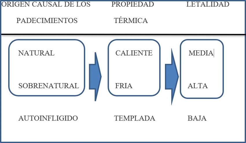 Para poder entender la perspectiva de la medicina indígena frente a la pandemia es preciso conocer la etiología de las enfermedades desde la visión de la etnomedicina. Así, podemos identificar tres tipos de padecimientos según su origen causal: los de clasificación natural, los considerados de etiología sobrenatural y los tipificados como autoinfligidos. A su vez, cada padecimiento puede ser clasificado de propiedad fría (letalidad alta), caliente (letalidad media) o templada (letalidad baja), salvo contraindicación del especialista; el diagnóstico será emitido por el terapeuta considerando varios factores, como tipo de alimentación, condición climática o tarea realizada (véase Figura 1).