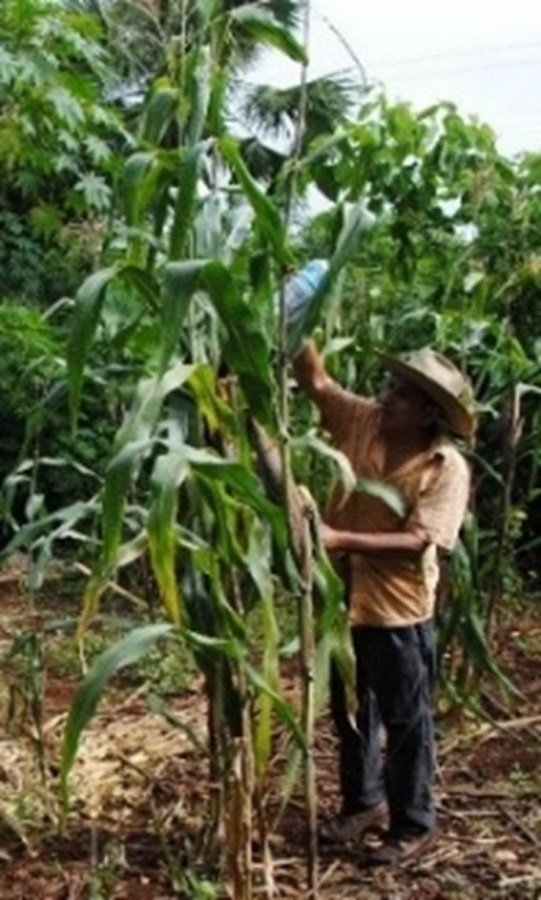 El curandero mencionó otros remedios botánicos para aliviar fiebres y dolores, los cuales aplicó en los enfermos de las rancherías que visitaba, como una hierba llamada xdasac y un palo llamado quichea (kibché)24 (véase Figura 5), que molió para untar en varias partes del cuerpo de los enfermos: «lo hizo por haber visto que los indios se valían de semejantes medios para curar»,25 a pesar de que desconocía las virtudes que tenían para sanar, según sus declaraciones. Si bien seguramente tenía explicaciones acerca de los dones de las plantas -vinculados con las deidades prohibidas- trató de evitarse más problemas con el inquisidor que lo estaba interrogando. Sus atenciones no se limitaron a los habitantes de los poblados bajo el dominio español, pues mencionó que curó a «una india cimarrona [es decir, de La Montaña] con un calabazo lleno de agua, compuesto de unas yerbas y su jugo, machacando [para que] se las diese a beber y untase la barriga con eso».26 El terapeuta dijo haber ido a curar también a la comadre de Diego Ávila a Tenabo, cerca de Hecelchakán. Ahí puso un altar con cuatro jícaras de balché (para adorar a las deidades de los correspondientes sectores cardinales) para que todos los presentes las bebieran, diciéndoles que así sanaría la enferma; además incluyó copal encendido.27 En otra ocasión, Zavala fue a ver a un hombre que «tenía caído» el brazo, le dijo que lo curaría si compraba un gallo, lo llevaba a una milpa y preparaba «un brebaje». De esta manera, el enfermo aportaría el animal que el terapeuta debía sacrificar y ofrendar a los «dueños de la milpa» (véase Figura 6), es decir, a las entidades protectoras de este lugar; ofrendaría también la bebida ritual balché. Estas acciones tenían la finalidad de contentar a las deidades que le habían causado el dolor del brazo, esto como castigo por no permitir que los mayas a su servicio realizaran las ofrendas para sembrar y obtener buenas cosechas. Sin embargo, el afectado parece no haber accedido a realizarlas por ir en contra de las normas católicas:
