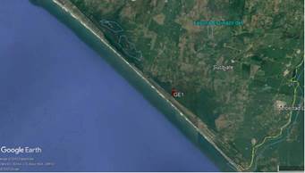 GE1 es uno de los más de 200 montículos identificados por PACS. El sitio consiste en un montículo ovalado, cuyo eje mayor presenta una orientación suroeste-noreste y mide 72 m. Su eje menor, sureste-noroeste, mide 51 m. Su altura es de 10.2 m sobre el nivel del mar y 5.3 m sobre el terreno circundante. GE1 forma parte del Complejo Gallo encantado; se localiza a 350 m de la playa y aproximadamente a 3.3 km al sureste de la boca del río Cahuacán, en el interior del manglar (véanse Figuras 1, 2, 3). Entre el sitio y la playa se encuentra un canal navegable por canoa, el cual forma parte de una amplia red que comunica diversas áreas del manglar (Neff, 2012; Romero, 2012). Dada su privilegiada ubicación, desde GE1 es posible tener acceso a los recursos necesarios para la producción de sal, como son el agua salada, combustible y arcillas. Los primeros trabajos de investigación, efectuados por PACS en GE1, determinaron que el núcleo del montículo se formó gradualmente por la acumulación de sedimentos lixiviados. Esto es consecuencia de la actividad salinera, tal como ocurre en otros montículos de la zona, entre ellos PIN7, CONQ18, RS3, RS23 y BER19.