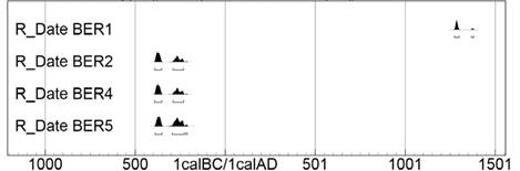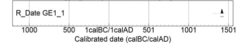 Gallo encantado con impresión textil representa un caso diferente. Su cronología fue establecida mediante una prueba de C14; arrojó una fecha ubicada dentro de los límites temporales del Posclásico Tardío. Es decir, entre 1400 y 1450 d. C. (véase Figura 10).
