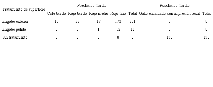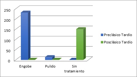 Como puede observarse en la Tabla 2, los conjuntos cerámicos del Preclásico Tardío, pertenecientes al Complejo Bermúdez, exhiben una variabilidad restringida en el tratamiento de superficie, que se reduce a solo dos variedades. Ambas muestran claras diferencias en cuanto a su frecuencia, predominando las vasijas con solo engobe exterior. En el caso de la cerámica del Posclásico Tardío, la variabilidad está claramente ausente, pues todos los tiestos de la colección carecen de tratamiento. La distribución y frecuencia del tratamiento de superficie exhiben el predominio de una sola variedad en ambos periodos (véase Figura 12). La presencia de este patrón nos permite sugerir que se trata de un rasgo funcional.
