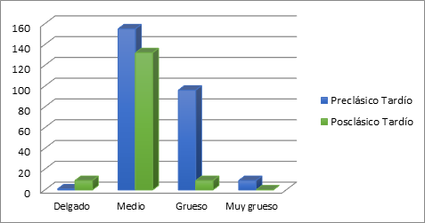 Los conjuntos cerámicos del Preclásico Tardío presentan variabilidad en cuanto al grosor de sus paredes. La frecuencia de cada variable difiere notablemente del resto, y se observa un mayor predominio de las paredes de tamaño medio, seguidas de las gruesas. En el Posclásico Tardío la variabilidad se ve reducida: desaparecen las paredes muy gruesas. No obstante, las de tamaño medio continúan siendo predominantes (véase Figura 13).