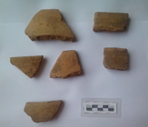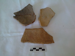 En este periodo observamos un cambio muy significativo en la cerámica salinera de GE1, ya que, a diferencia del anterior, en el Posclásico Tardío la decoración está totalmente ausente. El único rasgo apreciable en la superficie interior de las vasijas es la impresión textil interior, que también ha sido identificada en la cerámica de otros sitios Posclásicos ubicados en el Soconusco, entre ellos Acapetahua, Las Morenas (Voorhies y Gasco, 2004) y Gonzalo Hernández (Gasco, 2015). Sin embargo, estas vasijas no están asociadas con la producción de sal sino con actividades domésticas. Asimismo, fuera de la región del Soconusco se ha localizado cerámica salinera Clásica y Posclásica con impresión textil. Sisson (1973), Neely et al. (1997) y Castellón (2018) reportan la presencia de tiestos con impresión textil en el valle de Tehuacán, en Puebla. Charlton (1969) y Parsons (2015) , por su parte, informan de la existencia de abundantes concentraciones de un tipo cerámico con este rasgo en su superficie exterior, denominado Texcoco con impresión textil, en las salinas de la cuenca de México. En ambas regiones la cerámica presenta un alto grado de especialización y parece haber sido empleada en el secado o empaquetado de la sal (Parsons, 2015: 368).