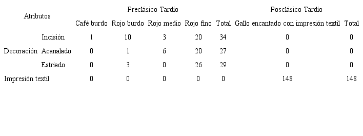 Los tipos cerámicos del Preclásico y Posclásico Tardío presentan una amplia variedad de atributos. No obstante, los de interés para esta investigación se limitan al tratamiento de superficie, decoración, grosor de la pared y forma de la vasija. Así pues, el primer atributo que se analizó fue la decoración. Para el Preclásico Tardío presentó un total de tres variedades de contraste. La cerámica del Posclásico Tardío no exhibió atributos decorativos; sin embargo, se observó la presencia de impresiones de textiles en la superficie interior de las vasijas (véase Tabla 1).