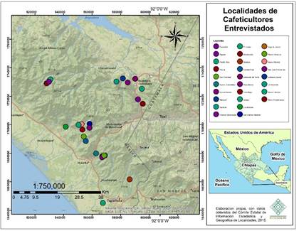 El estudio se realizó con familias de caficultores de seis diferentes cooperativas, asociadas todas a una federación de organizaciones denominada Federación de Indígenas Ecológicos de Chiapas (FIECH). La edad promedio de los caficultores es de 53 años, con una historia de 29 años dedicados a la caficultura, de los cuales, en promedio, han participado 17 años en cooperativas y nueve han cultivado el café bajo el esquema de producción orgánica. Se seleccionaron 30 localidades productoras de café de la región de la Sierra Madre del Sur de Chiapas, México, en los municipios de Amatenango de la Frontera, Bellavista, Escuintla, Frontera Comalapa, Huixtla, Montecristo de Guerrero, Tapachula y Tuzantán (véase Figura 1).